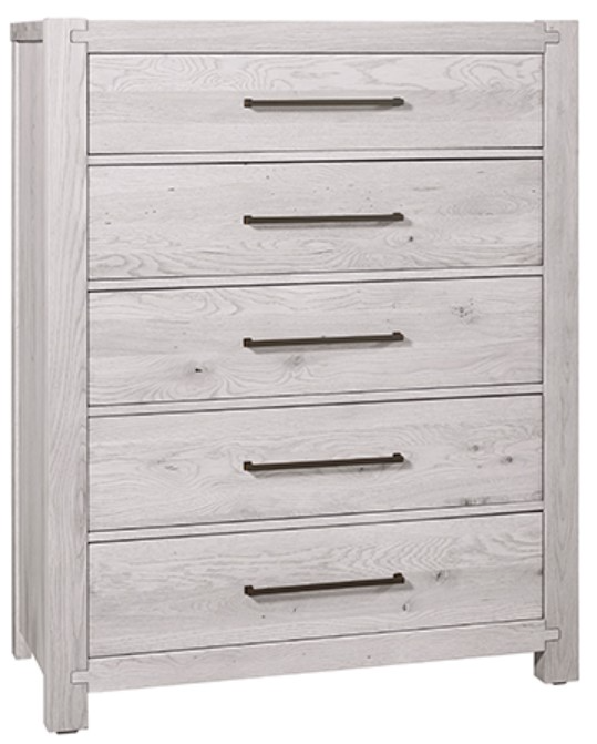 This chest with five drawers; shown in a washed white oak finish; offers a casual style to any bedroom in your home. It features a distinctive exposed tenon joint at the top and bottom.Read More