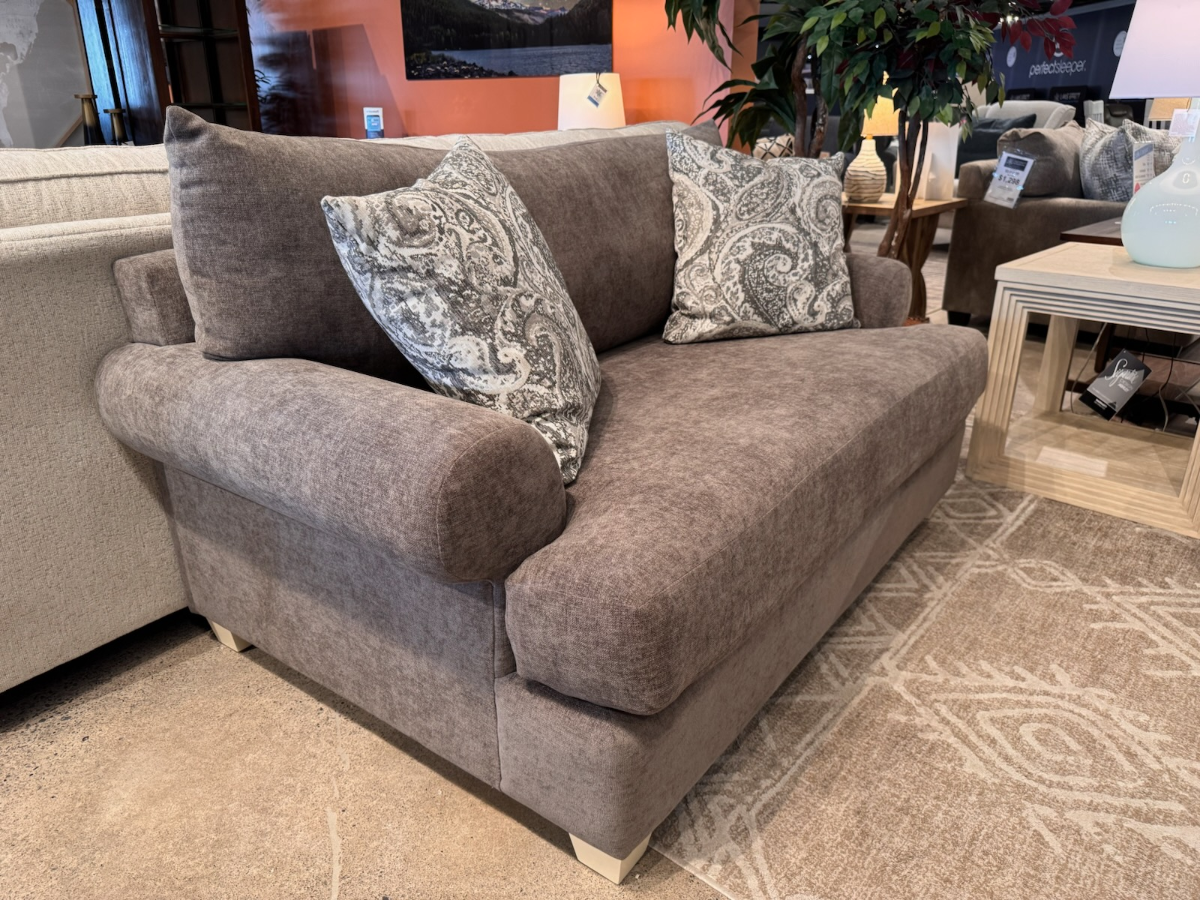 Shown in the store with the body fabric Noble Cocoa and pillows fabric Caramel Taupe