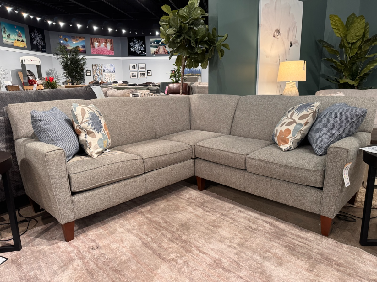 Shown in the store configured as a 2pc sectional (RAF Loveseat and LAF Corner Sofa) in the body fabric Brentwood Pepper, and pillows in Amzi Dragonfly and Pathfinder Indigo