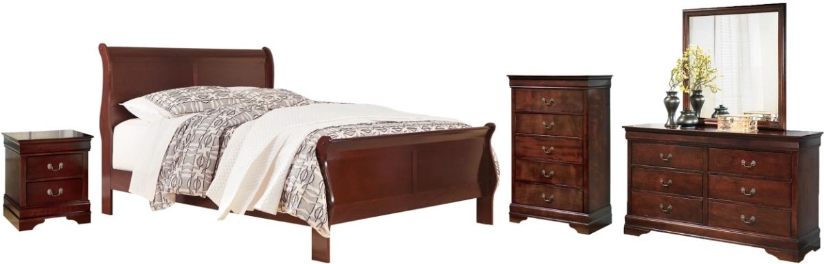 Includes California king sleigh bed (with headboard/footboard and rails), 6-drawer dresser with mirror, 5-drawer chest, and 2-drawer nightstand