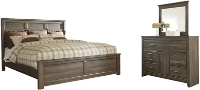 Includes panel bed (headboard, footboard and rails) and 6-drawer dresser with mirror