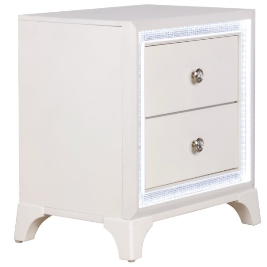 Bring a touch of ultra-glam to your space with the shimmering beauty of the Cassie 2-Drawer Nightstand. Its pearl finish and crystal-inlaid hardware exude sophistication,, while the dazzling crystal border lights up with the flip of a switch,, transforming the room with a soft,, enchanting glow.Read More