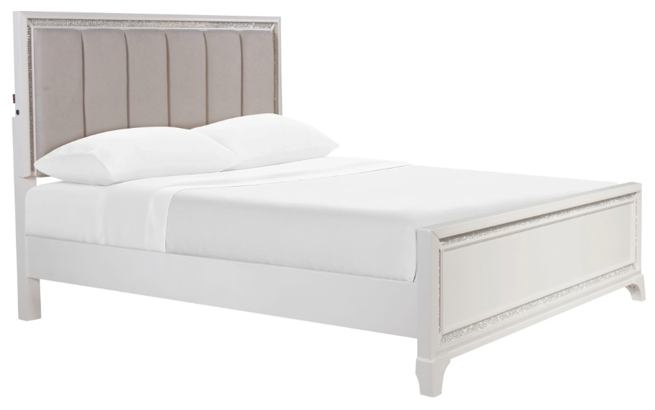 The headboard and footboard are accented with crystal in-laid borders tjhat sparkle with glam elegance. The headboard illuminates with a warm glow at the flip of a switch, creating an enchanting and inviting atmosphere