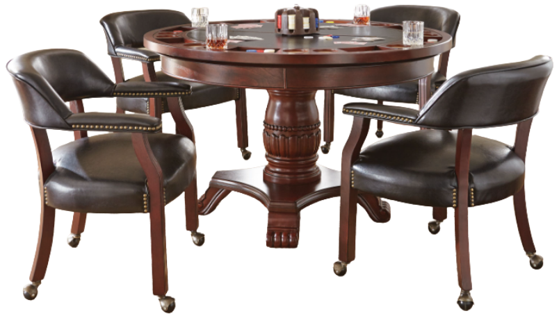 The game top folds and stores easily, and the table goes back to a dining table. The upholstered faux-leather captain’s chair has casters for easy mobility and comes in a wide range of colors, perfect for every decor.